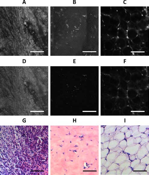 Figure 1: Images of invasive ductal carcinoma; scale bar: 0.1 mm. Fluorescence emission of tumor (A), fibroblasts (B), and adipose tissue (C). Corresponding fluorescence polarization of tumor (D), fibroblasts (E), and adipose tissue (F). Histopathology of tumor (G), fibroblasts (H), and adipose tissue sections (I).