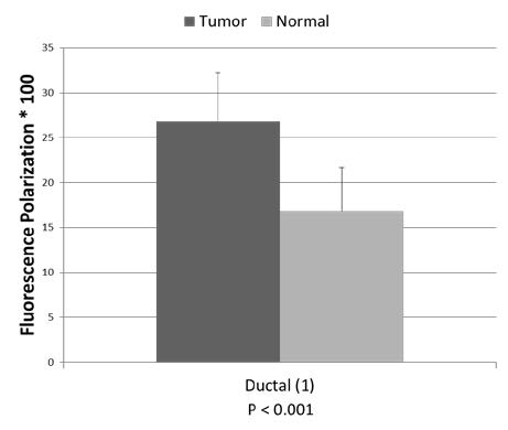 Figure 2: Confocal fluorescence polarization values (x100) averaged over cancer (dark gray) andnormal cells (light gray) of a ductal carcinoma specimen. Bars show standard deviations. P value is given for student’s t-test of two independent populations.