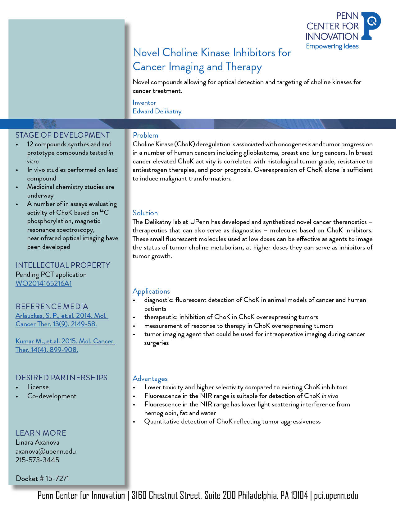The Delikatny lab at UPenn has developed and synthetized novel cancer theranostics – therapeutics that can also serve as diagnostics – molecules based on ChoK Inhibitors. These small fluorescent molecules used at low doses can be effective as agents to image the status of tumor choline metabolism, at higher doses they can serve as inhibitors of tumor growth.