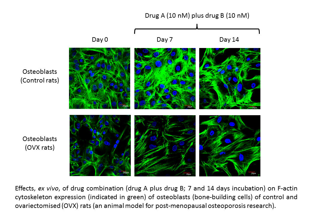 Osteoporosis, a silent disease, is a skeletal disorder characterized by compromised bone strength predisposing to an increased risk of fractures. The global burden of osteoporosis is significant nowadays – over 200 million people worldwide and approximately 30% of all postmenopausal women in the USA and Europe are affected by this disease. Osteoporosis occurs in both men and women because of aging and post-menopause. With an increase in life expectancy of the general population, it is anticipated that number of patients with this disease will be escalated within this decade and beyond. Despite recent successes with drugs that inhibit bone resorption, there is a clear need for anabolic agents that can substantially increase bone formation in patients who have already suffered substantial bone loss. Current therapeutic strategies such as hormone replacement therapy and bisphosphonates are effective but they are associated with serious side effects particularly after long-term uses. In contrast to monotherapy, combination drug therapy utilizes more than one medication with which individual agent is given at the lowest possible therapeutic dosage (i.e. minimal side effects are anticipated) and with additive/synergistic therapeutic outcomes resulted. In this project, the bone anabolic properties of two therapeutic agents, administered in combination (which has not been done and proposed before), have been determined by evaluating the levels of bone formation biomarkers, e.g. alkaline phosphatase (ALP), bone morphogenetic protein-2 (BMP-2) and osteocalcin (OCN), Alizarin red (for mineralized extracellular matrix) and a novel protein (which is important in altering cellular Ca2+ levels) which we recently discovered in bone cells of rats (normal and ovariectomised rats). Similar to other diseases (e.g. AIDS, peptic ulcer) using similar treatment regime, combination drug therapy in our study has provided desirable additive bone anabolic effects, ex vivo, in bone cells of ovariectomized rats (an animal model for human estrogen-deficiency / post-menopausal associated osteoporosis).